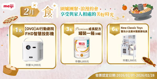 2月期間內購買明治配方Premium系列商品,單筆滿千發票登錄即有機會抽中萬元好禮,智慧投影機等你抽!
