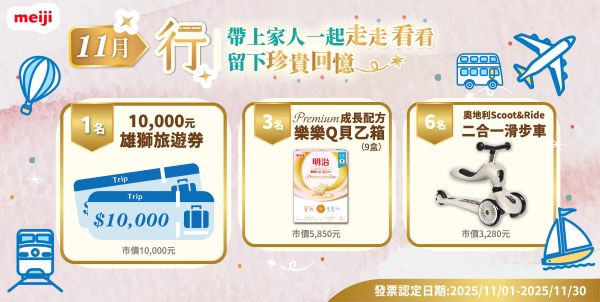 【育兒好時光 有明治更開心】登錄發票活動 9/1起買明治配方指定商品 (不含 Premium系列),單筆消費金額滿千抽最新 iPhone,滿額送 BMW 兒童電動車 活動日期: 2025/09/01-10/31