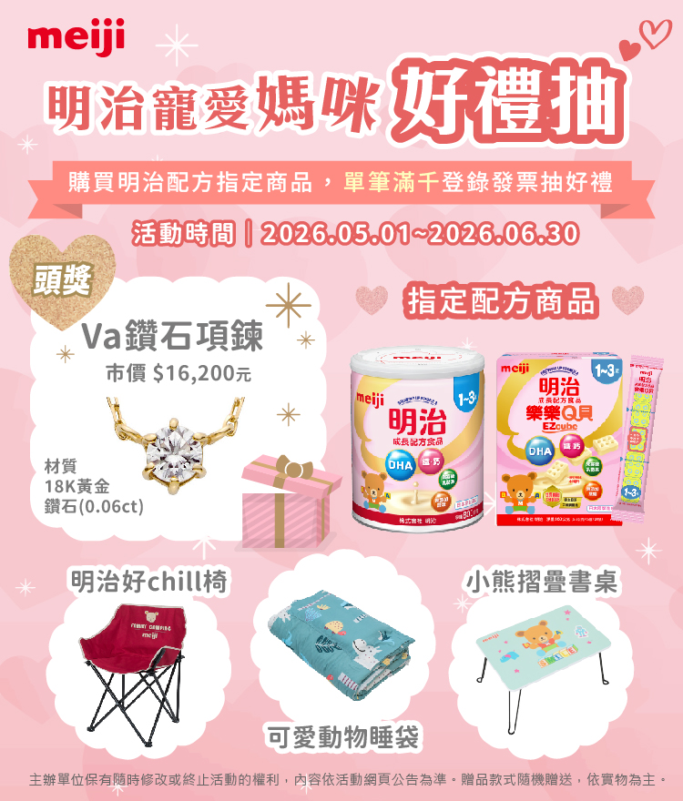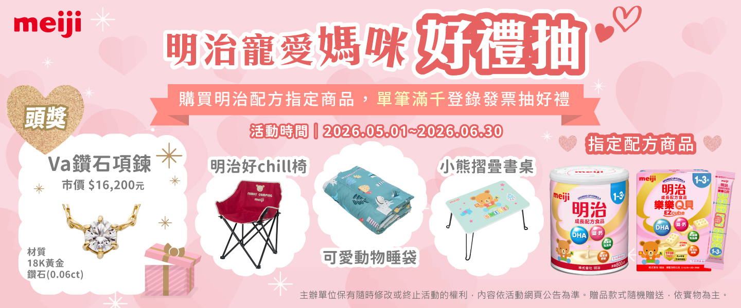 2026/05/01~2026/06/30 購買明治配方指定商品(不含Premium line 系列) 單筆滿千元,登錄發票就有機會把奢華 Va 鑽石項鍊帶回家,讓明治為您的生活加點『鑽』!!
