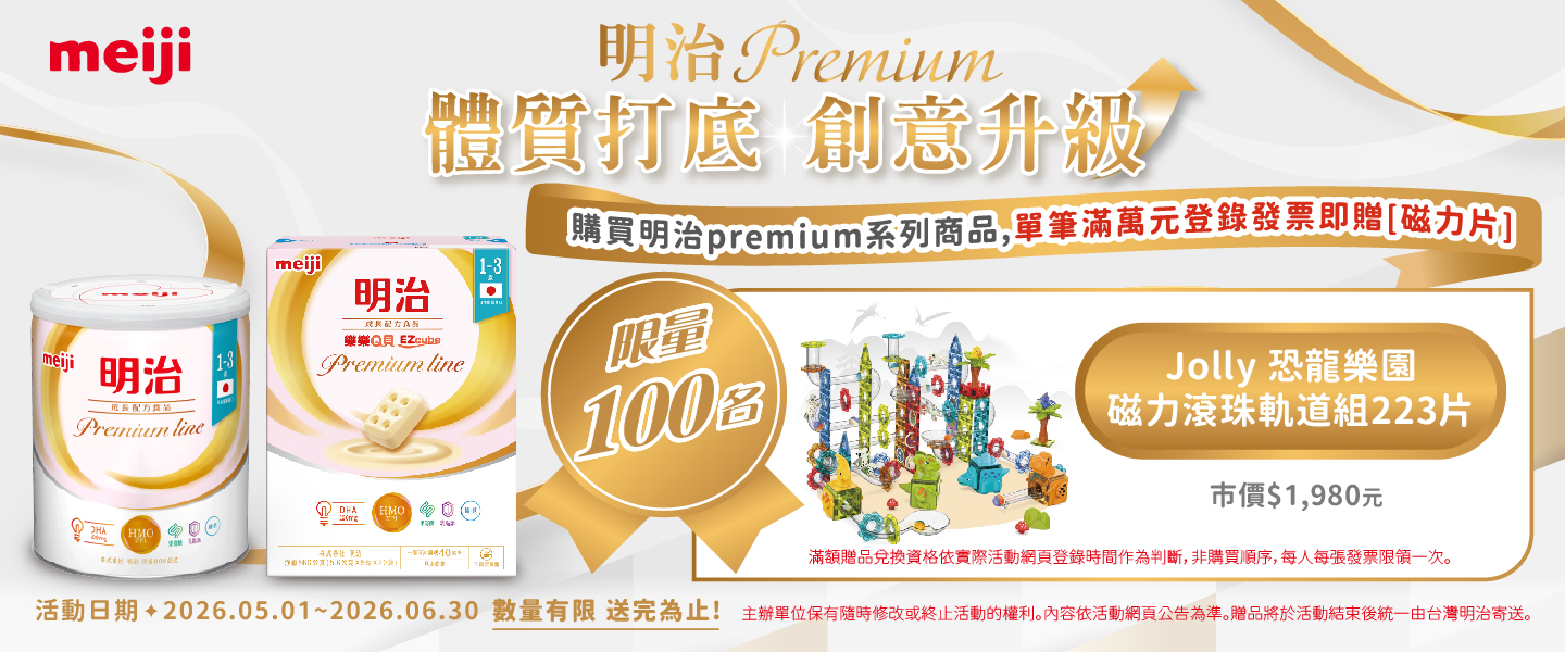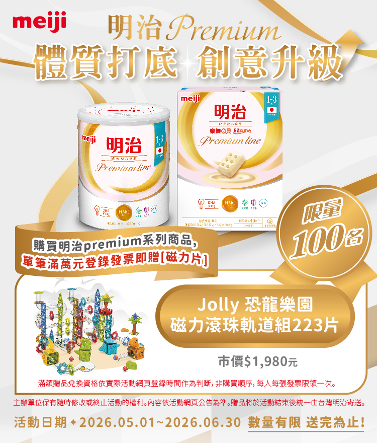 2026/05/01~2026/06/30 凡購買明治premium line系列商品單筆消費滿$10,000,登錄發票即送Jolly恐龍樂園磁力滾珠軌道積木組223片 市價1,980】乙組