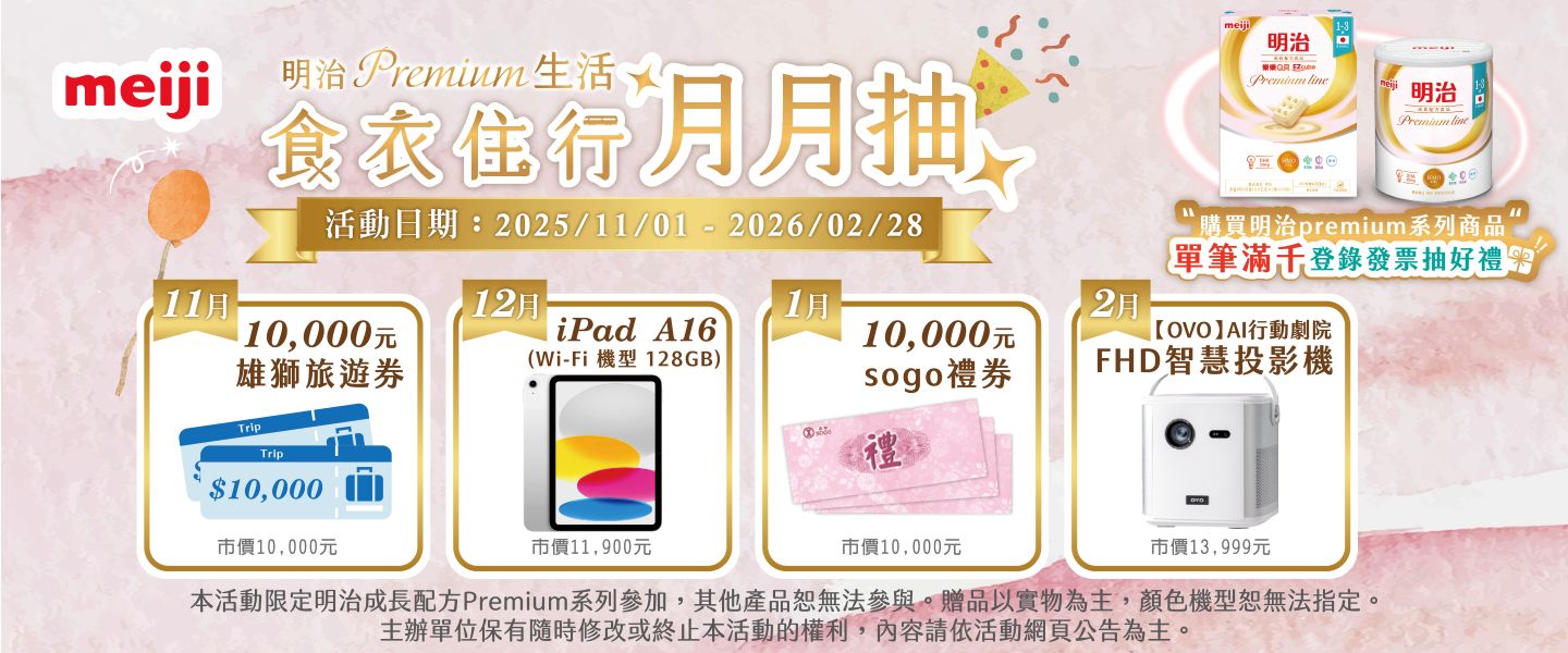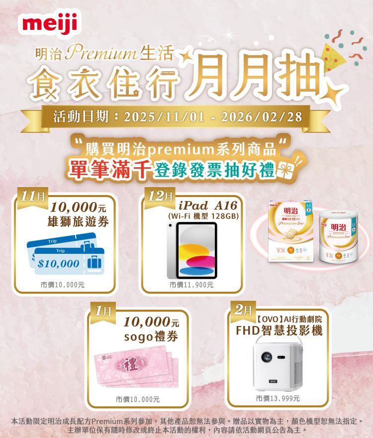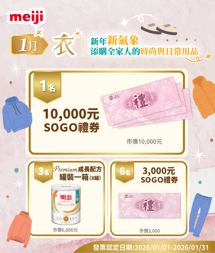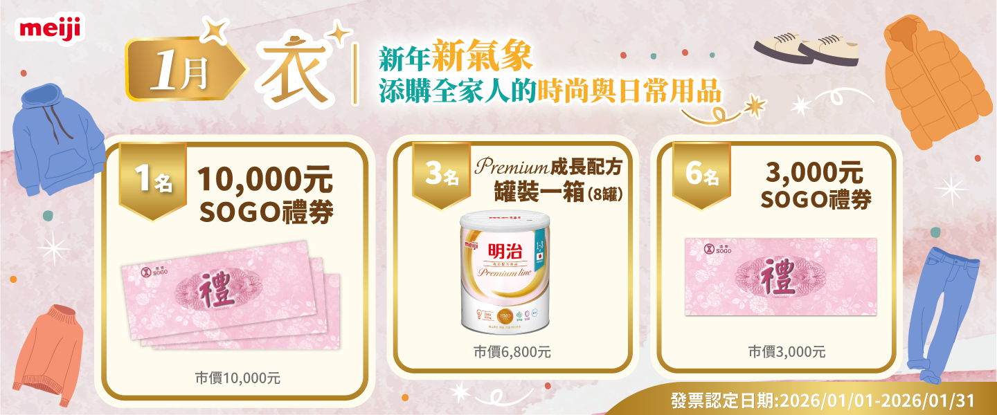 2026/01/01~2026/01/31 購買明治成長配方 premium line 系列商品單筆滿千元,登錄發票即可抽萬元SOGO禮券、premium line 成長配方罐裝一箱、3,000元SOGO禮券 ,打造自信時尚生活!