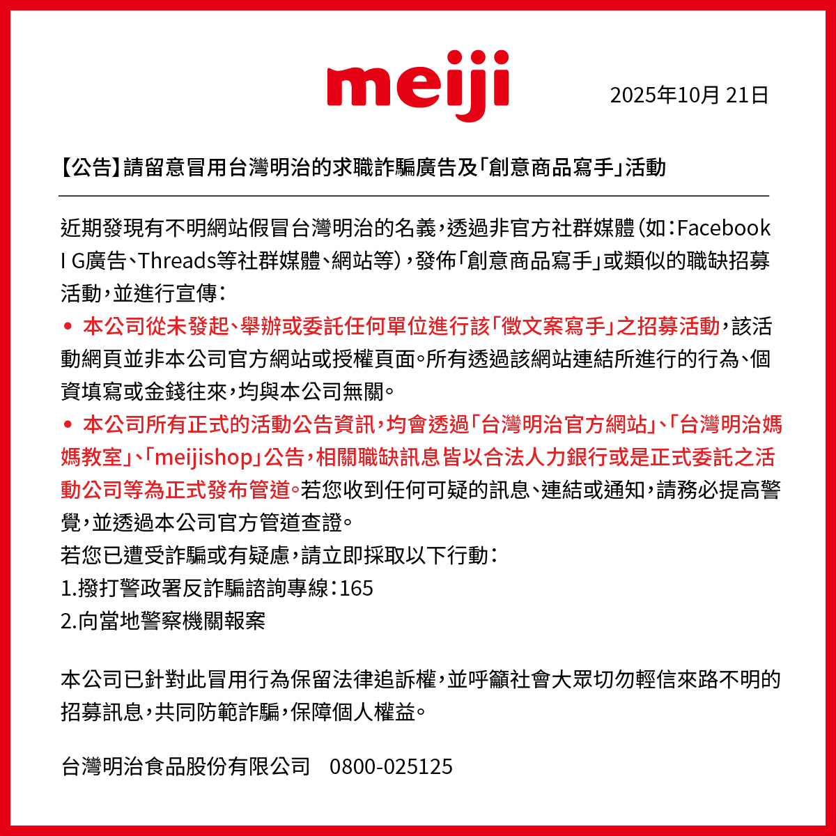 - 本公司所有正式的活動公告資訊,均會透過「台灣明治官方網站」、「台灣明治媽媽教室」、「meijishop」公告,相關職缺訊息皆以合法人力銀行或是正式委託之活動公司等為正式發布管道。若您收到任何可疑的訊息、連結或通知,請務必提高警覺,並透過本公司官方管道查證。