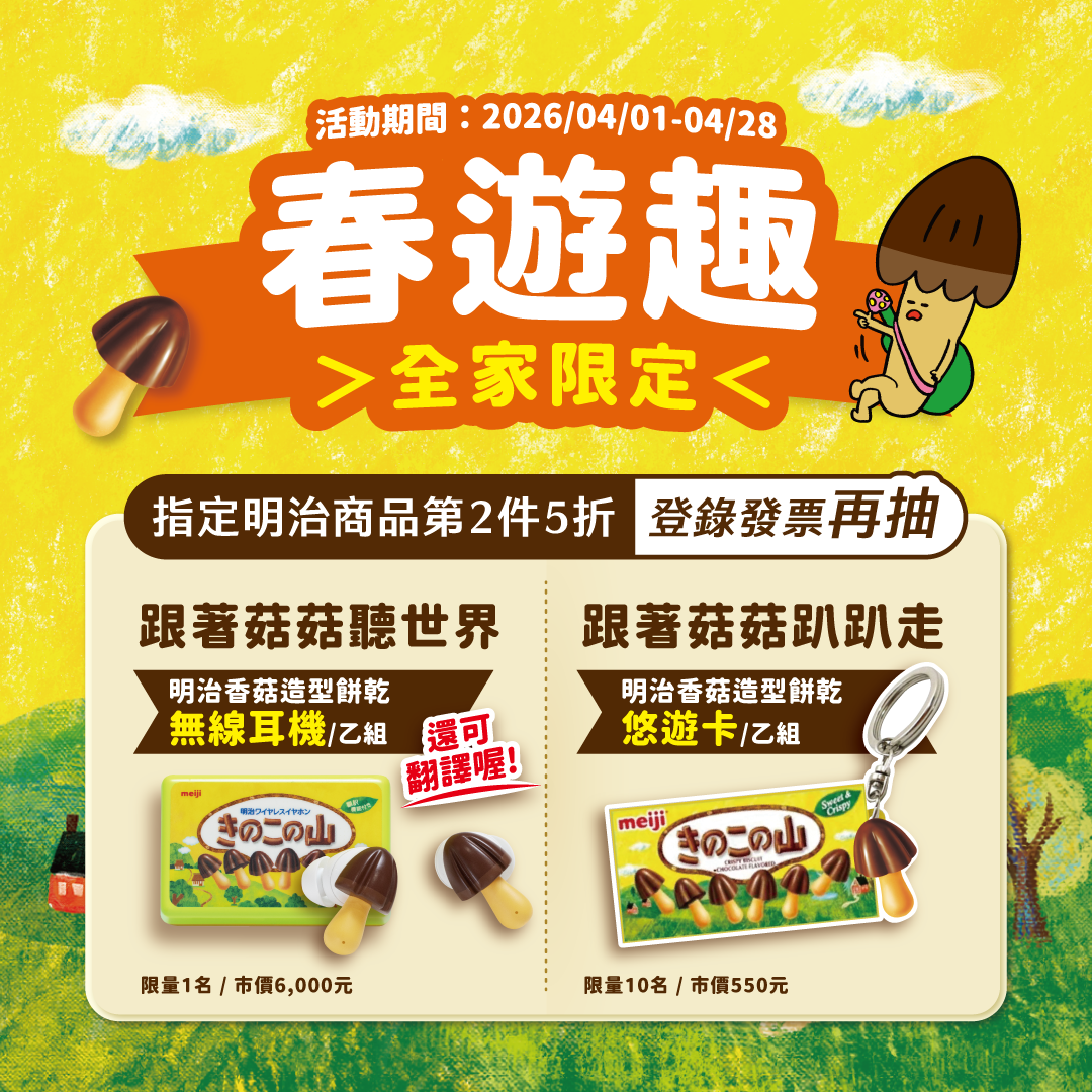 到了春天最適合跟著家人三五好友一起趴趴走,讓隨身帶著走的明治可可製品、軟糖、餅乾,來全家一起開啟春日小旅行,還可以抽限量菇菇好禮喔。